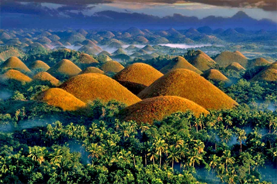 تعتبر "تلال الشوكولاتة" مكاناً سياحياً وإحدى عجائب العالم في الفلبين، يعتقد العلماء أنها مكونة من مجموعة من الصخور، أما شكلها فهو يشبه الهرم مغطى بطبقة من الطين وينبت عليه عشب أخضر لكنه يتحول في موسم الصيف إلى لون بني فتشعر أن هذه التلال وكأنها مكسوة بالشوكولاتة وحتى رائحتها تصبح كالشكولاتة، ولذلك سميت بهذا الاسم، أما في الفترات الممطرة فيعود لونها إلى الأخضر.