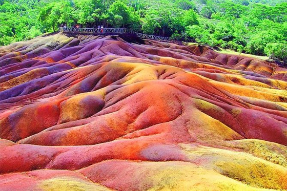 أرض السبعة ألوان وهي منطقة حقيقية على الأرض، تقع في المحيط الهندي تتألف هذه المنطقة من كثبان رملية بسبعة ألوان مختلفة، وهي الأحمر والبني والبنفسجي والأخضر والأزرق والأرجواني والأصفر وقال العلماء إن سبب ظهور هذه الألوان يعود إلى تحلل الصخور البركانية وامتزاجها بالمياه التي حولتها إلى طين ومن ثم إلى تربة غنية بالحديد المسؤول عن ظهور اللون الأحمر ومادة الألمنيوم المسؤولة عن ظهور اللونين الأزرق والأرجواني وتعد هذه المنطقة من أكثر المناطق السياحية جذباً للسياح لكن لا يسمح بالمشي عليها حيث أقيم سياجاً كبيراً حولها للاستمتاع بالمشهد الرائع.