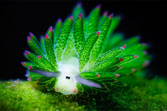ينتمي خروف أوراق الشجر الى الرخويات وهو صغير الحجم وجميل المنظر، حيث يمتلك خدوداً وردية وعينين جميلتين ويتزين جسمه بأوراق تشبه أوراق الشجر، ويمكن رؤيته قرب سواحل اليابان وإندونيسيا والفلبين، ويتكون غذاؤه من الأعشاب والطحالب البحرية. عندما يتغذى خروف أوراق الشجر على الطحالب فانه يستطيع بذلك انتاج الضوء المتوهج منه.