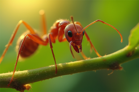 - حشرة النملة وهي فصيلة من الحشرات الاجتماعية، تملك دماغاً معقداً تستطيع من خلاله التفكير وإجراء الحسابات اللازمة، ولها ستة أرجل تنتهي كل واحدة منها بمخالب، فتستعملها للمشي ولتنظيف جسمها ومعالجة غذائها ولها قرون تتحسس وتتذوق الغذاء بها ويعد هذان القرنان هما المصدر الذي تحصل من خلاله على المعلومات وإرسالها عن بعد، ولها عيون مركبة تستطيع بواسطتها أن ترى الأشياء، ولكن رؤية النمل تكون ضعيفة وذلك لأنه يمضي معظم وقته تحت التراب وفي الظلام.