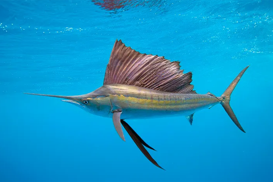 تتواجد سمكة الزعنفة الشراعية في الأجزاء الدافئة من كل محيطات العالم، وتمتلك زعنفة ظهرية تمتد على طول الظهر تسمى بالشراع ويصل طولها الى اكثر من متر ونصف المتر وتعرف بلونها الرمادي أو الأزرق، وتتميز بفكها العلوي الطويل الذي يشبه الرمح. سمكة الزعنفة الشراعية هي أسرع سمكة في العالم حيث تبلغ سرعتها نحو ١١٠ كيلومتر في الساعة.