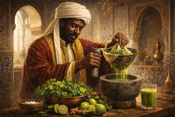 كان زرياب قد تعلم طبق "التفاية الخضراء" من إبراهيم بن المهدي في العراق، ثم نقلها إلى الأندلس حين قدم إليها قبل أكثر من ألف عام. فقد كان الأندلسيون مغرمين بالكزبرة فكانوا يعصرون الكزبرة الخضراء مع النعناع لاستخراج كمية كبيرة من العصير الأخضر النقي، ولكن لم يتخذوه شرابا، بل استعملوه في الطبخ. لكن هذا يعني أن فكرة استخلاص عصائر الورقيات الخضراء سبقت رواج العصير الأخضر في العصر الحديث.