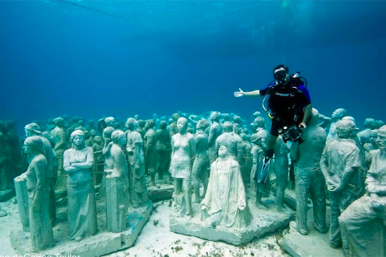 أنشئ أول متحف في العالم تحت الماء لصرف انتباه الغواصين عن مناطق الشعاب المرجانية التي تضررت بسبب كثافة الزيارات، وتوجيههم إلى موقع جديد صمم ليكون أكثر فائدة للبيئة البحرية، إذ يهدف إلى مساعدة الكائنات البحرية على النمو وإنعاش الثروة البحرية بدلاً من الإضرار بها، ويضم متحف التطور الصامت ٥٠٠ منحوتة تعد من أبرز أعمال النحاتين المكسيكيين، كما يشتمل على ثلاث صالات عرض مغمورة تحت الماء على أعماق تتراوح بين ثلاثة وعشرة أمتار، وتعبر جميع منحوتاته عن علاقة الإنسان بما يحيط به، وقد صممت بمواد لا تحتوي على مركبات كيميائية تضر بالمياه أو الأسماك أو الشعاب المرجانية، واستخدم في تنفيذ المشروع ١٢٠ طناً من الخرسانة والرمل والحصى، و٣٨ ألف طن من الألياف الزجاجية، و٤٠٠ كيلوغرام من السيليكون، إلى جانب مئات ساعات العمل تحت الماء، وصنعت التماثيل بدرجة حموضة مدروسة في الخرسانة حتى تتحول مع الزمن إلى شعاب اصطناعية، كما زرعت بالقرب منها بعض أنواع الشعاب المرجانية مثل مرجان النار، لذلك فإن استكشاف هذا المتحف يقوم على جانبين متكاملين، الأول هو مشاهدة المنحوتات الغارقة نفسها، والثاني هو متابعة ما تصنعه الطبيعة فوقها من حياة جديدة وأحياء بحرية تنمو وتتشكل مع مرور الوقت.