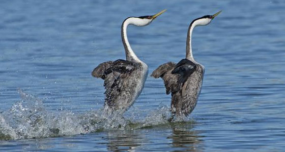 الطيور المائية التي تتغذى على الأسماك يصعب حصرها، وكلها تتميز بالقدرة على الطيران فوق الماء ثم الغطس السريع لالتقاط الصيد. لكن هناك نوعاً مثيراً من الطيور لا يستطيع الغطس أو السباحة، بل يمشي فقط فوق الماء، ويجري ويمرح ويختار شريكة حياته أثناء المشي فوق الماء. هذا الطائر ينتمي إلى نوع يسمى الجريب، وينتشر في عدد من قارات العالم. وأشهره وأغربه طيور المناطق الشمالية من أوروبا والولايات المتحدة.ومن غرائب هذه الطيور أن الإناث والذكور تتعاون في بناء عش الزوجية فوق الماء، ويتكون من أوراق وفروع الأشجار ليبدو أشبه بقارب يتهادى على الماء. ورغم أن الزوجين يتناوبان حضانة البيض حتى الفقس، فإن الذكور تقوم بمهمة أخرى تتمثل في احتضان الصغار تحت ريشها. وأحياناً تحمل الأم صغارها بمجرد خروجها من البيض في منطقة دافئة فوق ظهرها، وتغوص في الماء لتصطاد الغذاء وتقدمه لصغارها وهي طافية فوق الماء، إلى حد يشعرك بوجود قارب سحري يحمل الأم وصغارها.